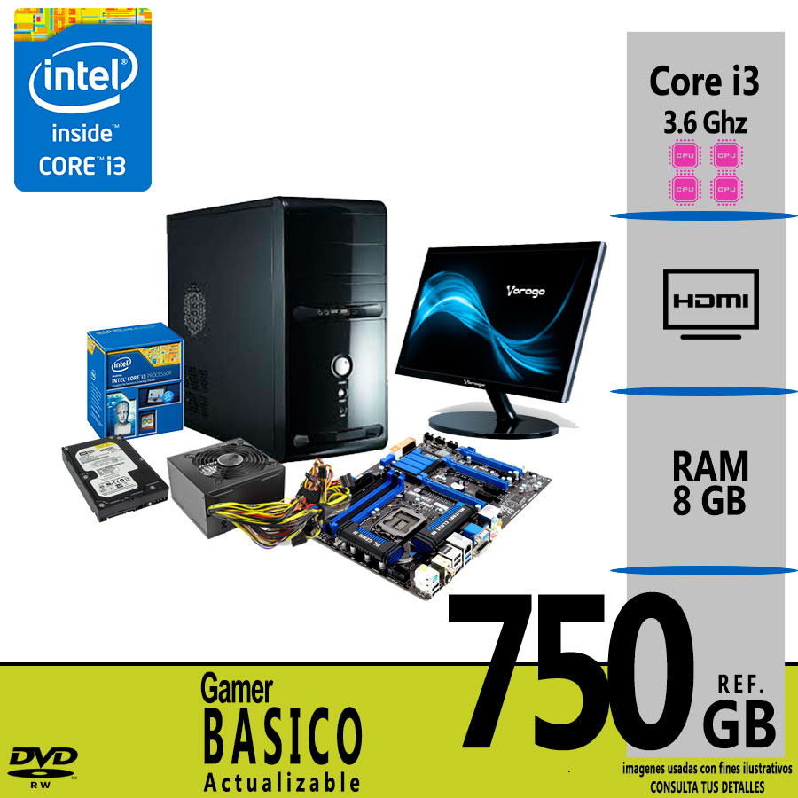 Motherboard Gigabyte B85M-D3V / Procesador Intel Core i3 4160 3.6 GHz / DDR3 Kingston Fury 8 GB 1600 Mhz / Disco duro Reconstruido en fabricante 750GB / Gabiente Generico Acteck Akron con fuente de 500 watts / DVD-RW Sata Samsung 24x /Kit teclado mouse y bocinas 3 en 1 Hip hop / Monitor Nuevo LED de 18.5 pulgadas Entrada VGA Marca Vorago